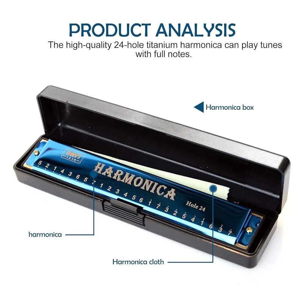 Découvrez l'harmonica 24 trous en titane pour des sons riches et complets. Parfait pour les musiciens débutants et confirmés, son design élégant et étui de protection le rendent idéal pour le transport. Apportez de la musique partout!