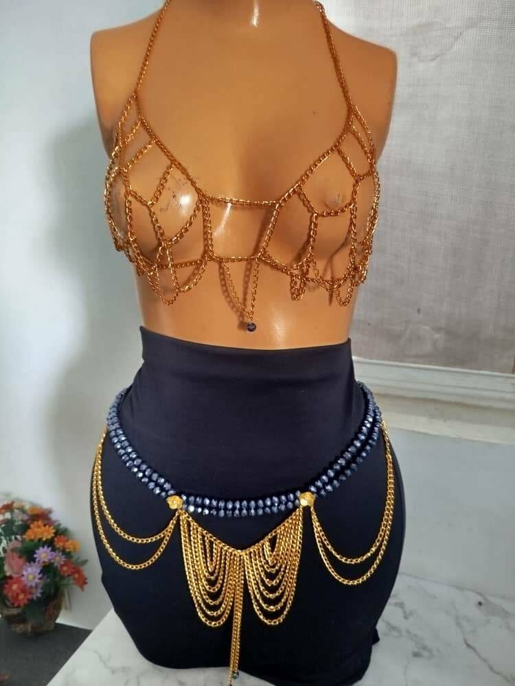 Harnais en chaîne dorée élégant, parfait pour rehausser toute tenue. Idéal pour une soirée spéciale ou un festival. Confortable à porter et ajustable. Matériaux de haute qualité pour une durabilité accrue. Ajoutez une touche audacieuse et glamour à votre garde-robe.