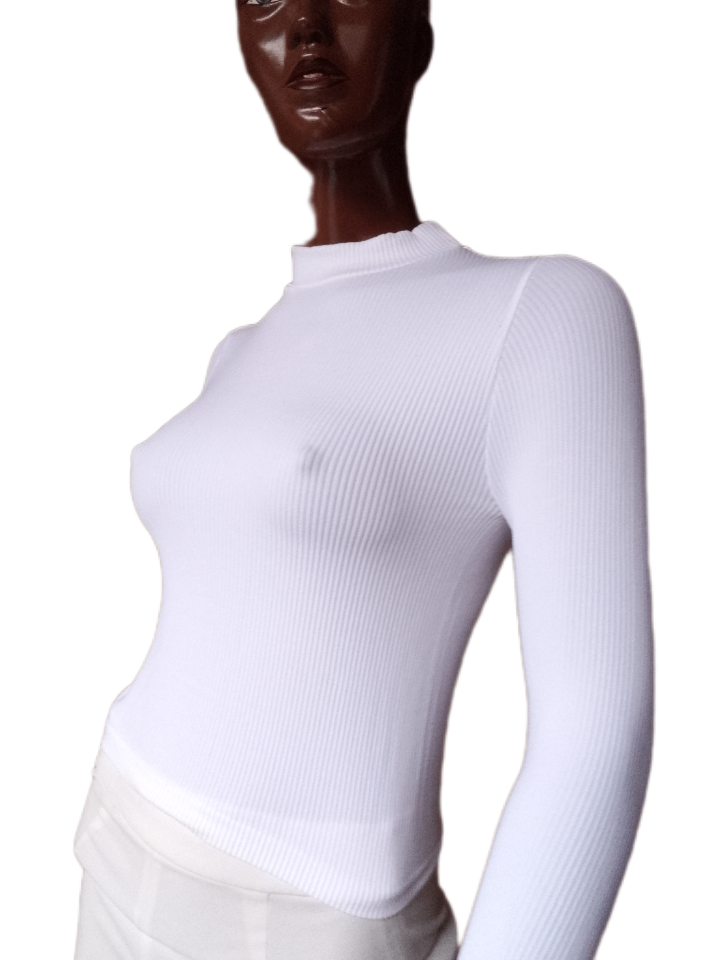Ce haut à manches longues blanc pour femme est idéal pour un look élégant et moderne. Fabriqué en matière côtelée, il épouse parfaitement la silhouette pour un confort optimal. Parfait pour les journées fraîches ou comme base sous un blazer, ce vêtement polyvalent complétera votre garde-robe avec style.