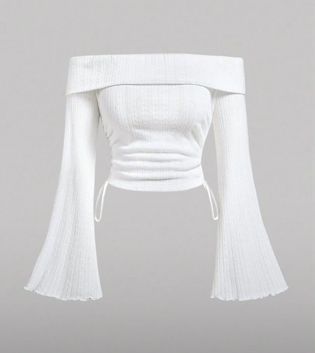 Ce haut blanc à épaules dénudées est idéal pour un style chic et élégant. Confectionné en tissu côtelé, il présente des manches longues évasées pour une touche vintage. Parfait pour une soirée ou un rendez-vous, il s'accorde facilement avec des jupes ou des jeans. Un must-have pour toute garde-robe moderne.