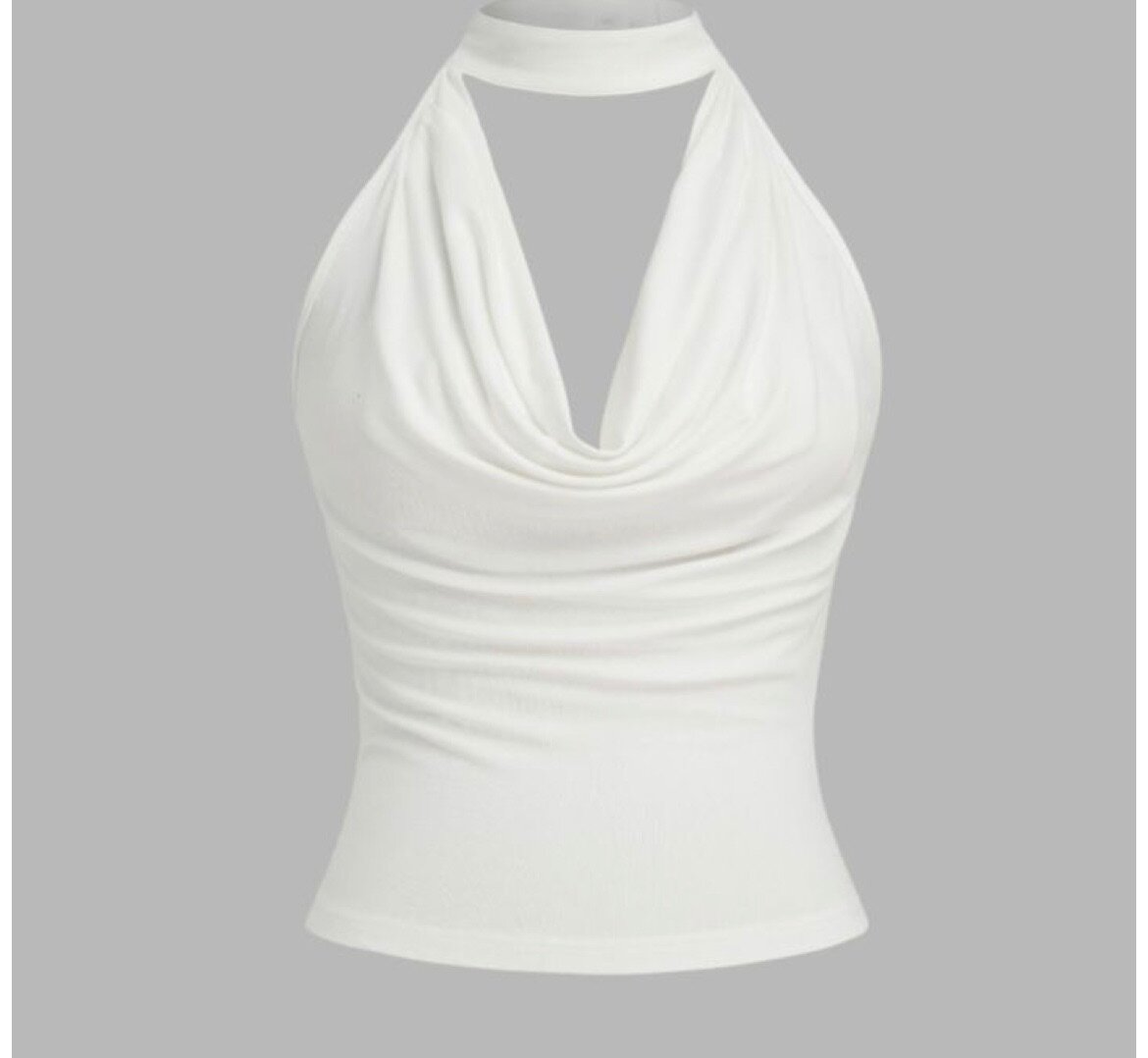 Haut blanc sans manches avec encolure drapée, parfait pour une soirée élégante ou une tenue décontractée rafraîchissante. Facile à assortir avec différents styles. Tissu doux et confortable qui épouse la silhouette pour un look séduisant et tendance.
