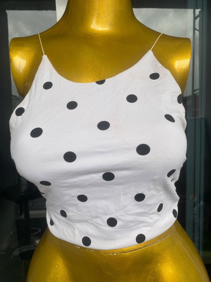 Ajoutez une touche rétro à votre garde-robe avec ce haut court à pois pour femmes. Parfait pour un look estival, ce haut est idéal pour les sorties décontractées ou une journée à la plage. Associez-le à une jupe ou un jean pour un style chic et tendance.