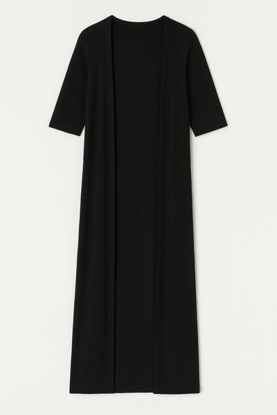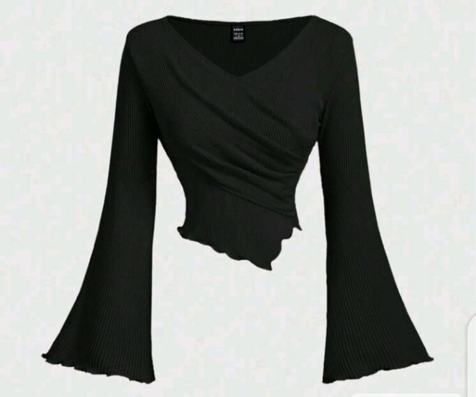 Haut féminin noir avec manches évasées et ourlet asymétrique. Idéal pour une touche d'élégance au quotidien. Confortable et chic, parfait pour toutes les occasions.