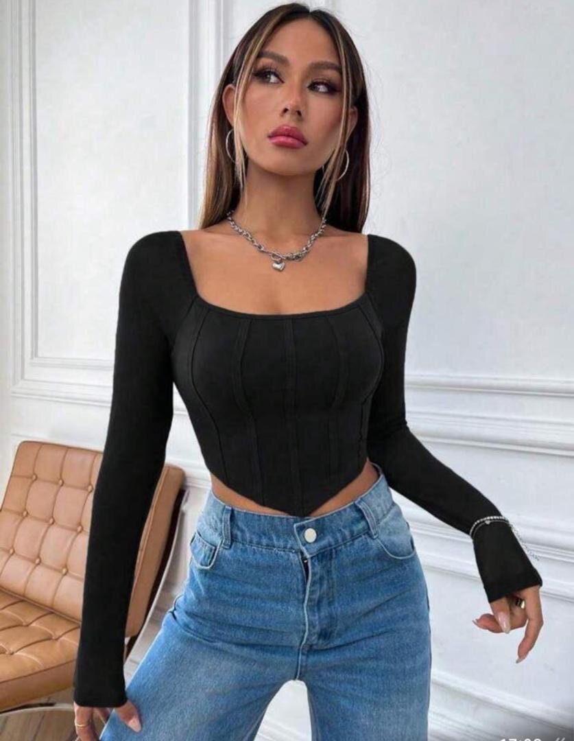 Élégant haut noir à manches longues pour femme. Conçu avec un décolleté carré flatteur et une coupe qui souligne la silhouette. Parfait pour des occasions spéciales ou une soirée décontractée.
