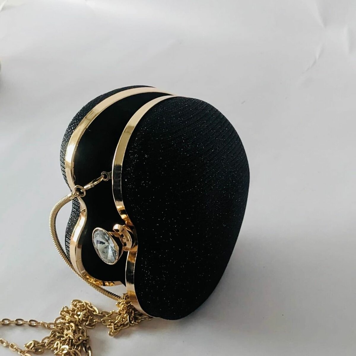 Heart-shaped clutch. Comes with long land short handles. Made from polyester and metal. Perfect for evening programmes.