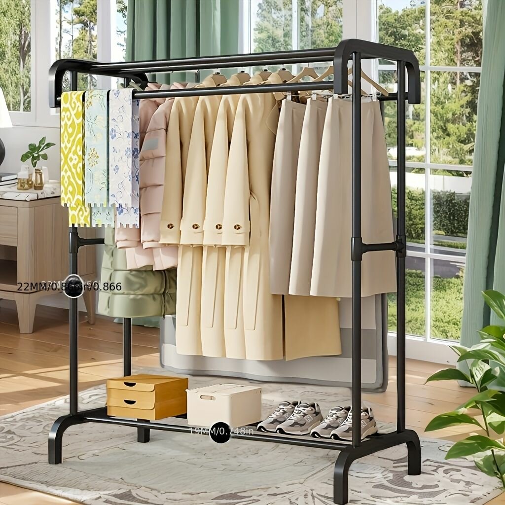 This heavy-duty clothing rack features a strong load-bearing capacity wood design with multi-hanging poles for organized storage. Ideal for homes, offices, or boutiques, it provides ample space with a stylish black finish. Move easily with caster wheels. Perfect for coats, dresses, and more.