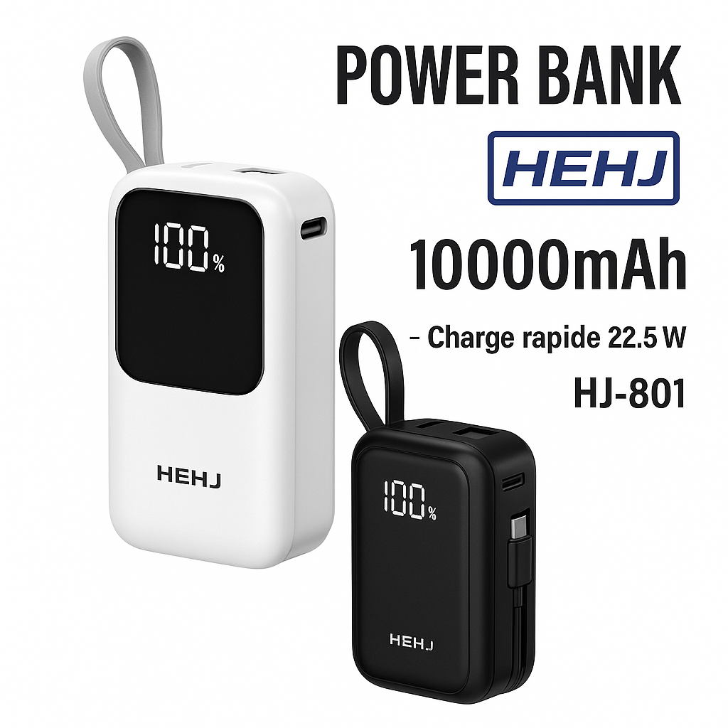 Découvrez le Power Bank HEHJ 10000mAh, conçu pour une recharge rapide de 22,5W. Son design compact avec écran d'affichage et compatibilité complète le rend pratique pour tous vos déplacements. Ne soyez jamais à court d'énergie avec cet appareil performant!