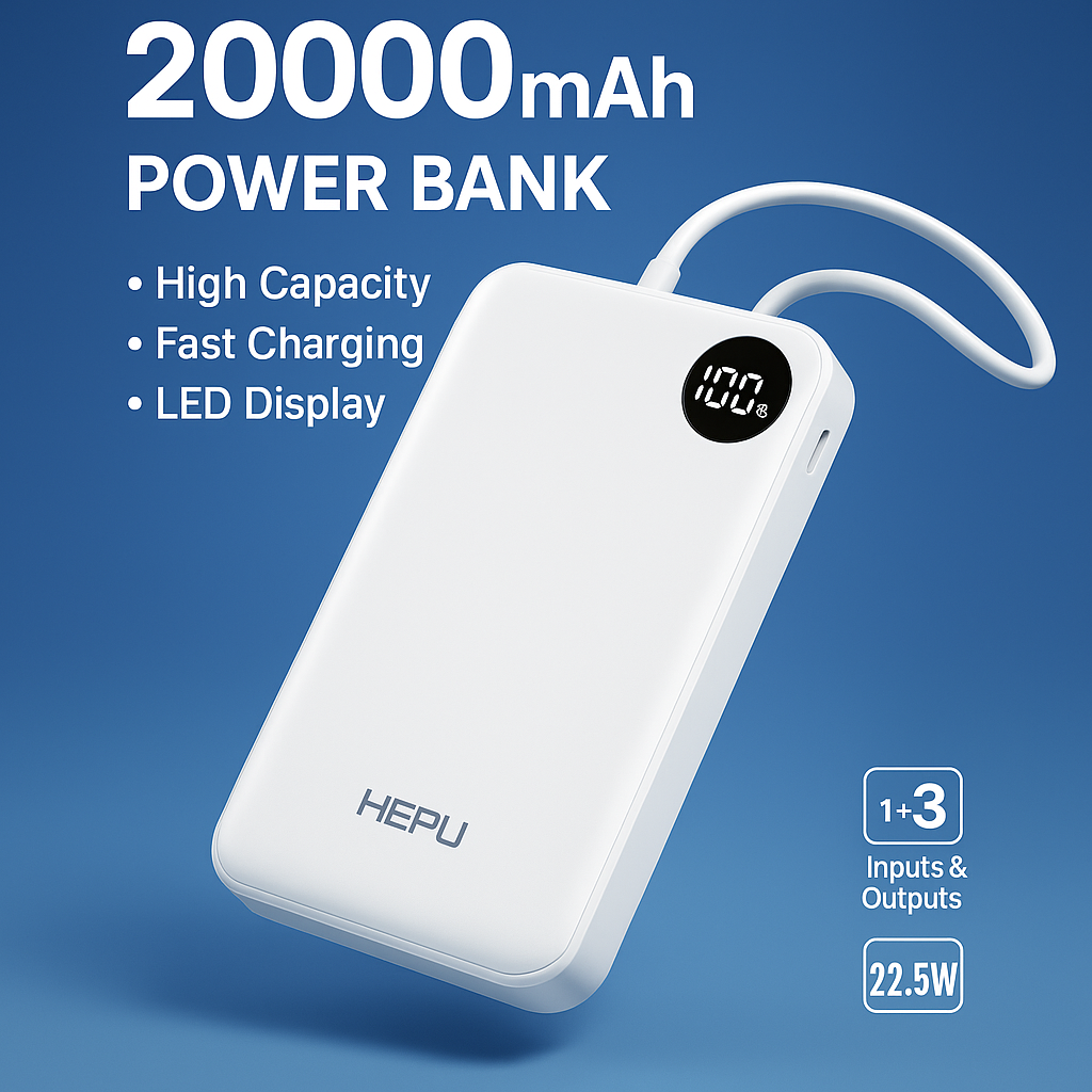 Restez alimenté toute la journée avec le Powerbank HEPU 20000mAh. Doté d'une grande capacité, d'une charge rapide et d'un écran LED clair, il est parfait pour les voyages et l'utilisation quotidienne. Chargez facilement plusieurs appareils et gardez vos gadgets prêts lorsque vous en avez besoin. Idéal pour les smartphones, les tablettes et plus encore.