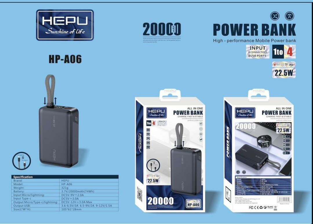 Puissante batterie externe HEPU de 20000mAh avec 22,5W pour chargement rapide. Parfait pour mobiles et tablettes. Idéal pour les voyages et l'usage quotidien.