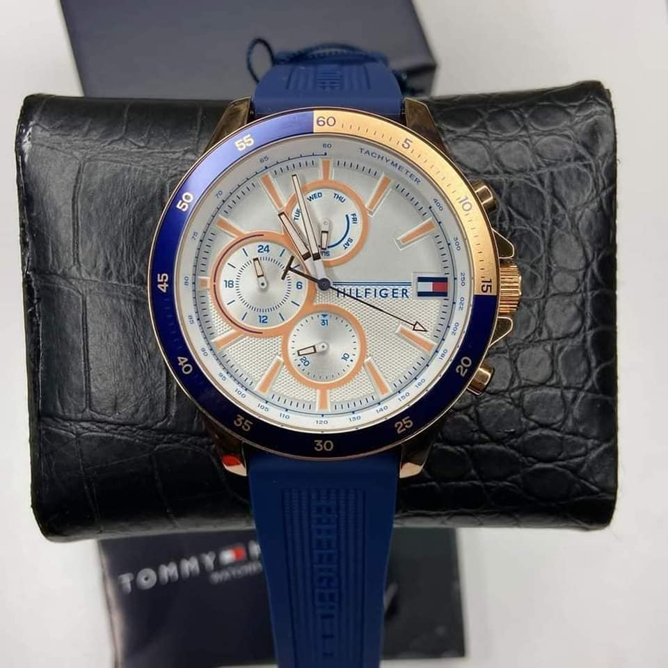 hilfiger montre avec cadran blanc et bracelet bleu
