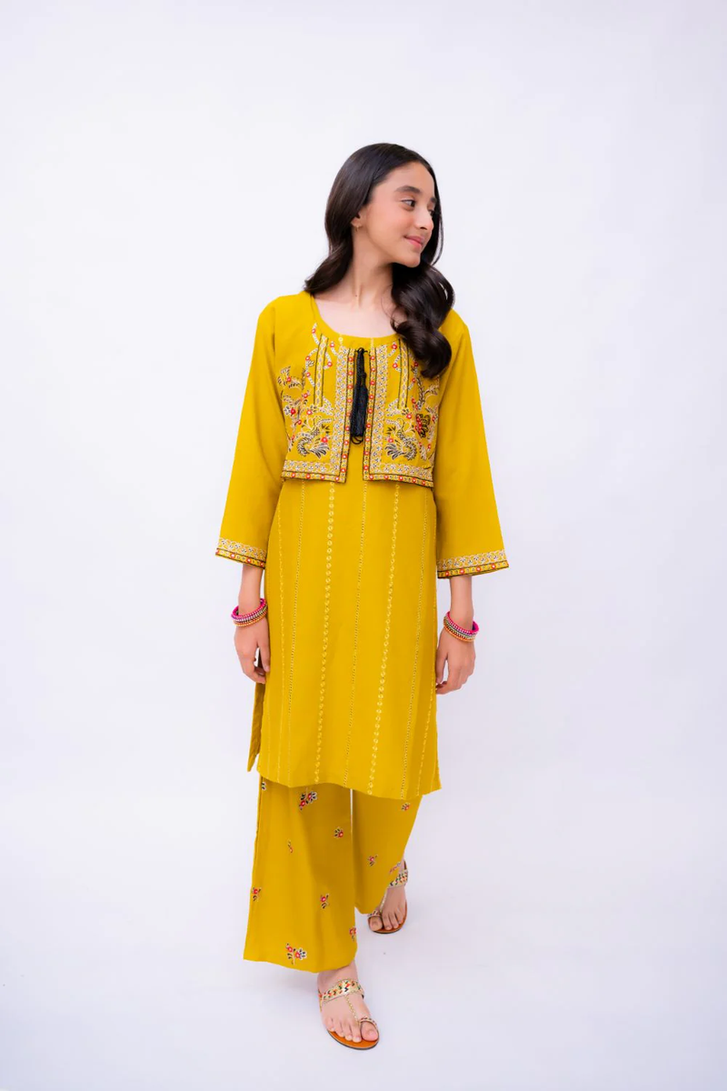 This elegant 2-piece outfit features a beautifully embroidered jacket paired with a stylish shirt and comfortable flapper embroidered trouser