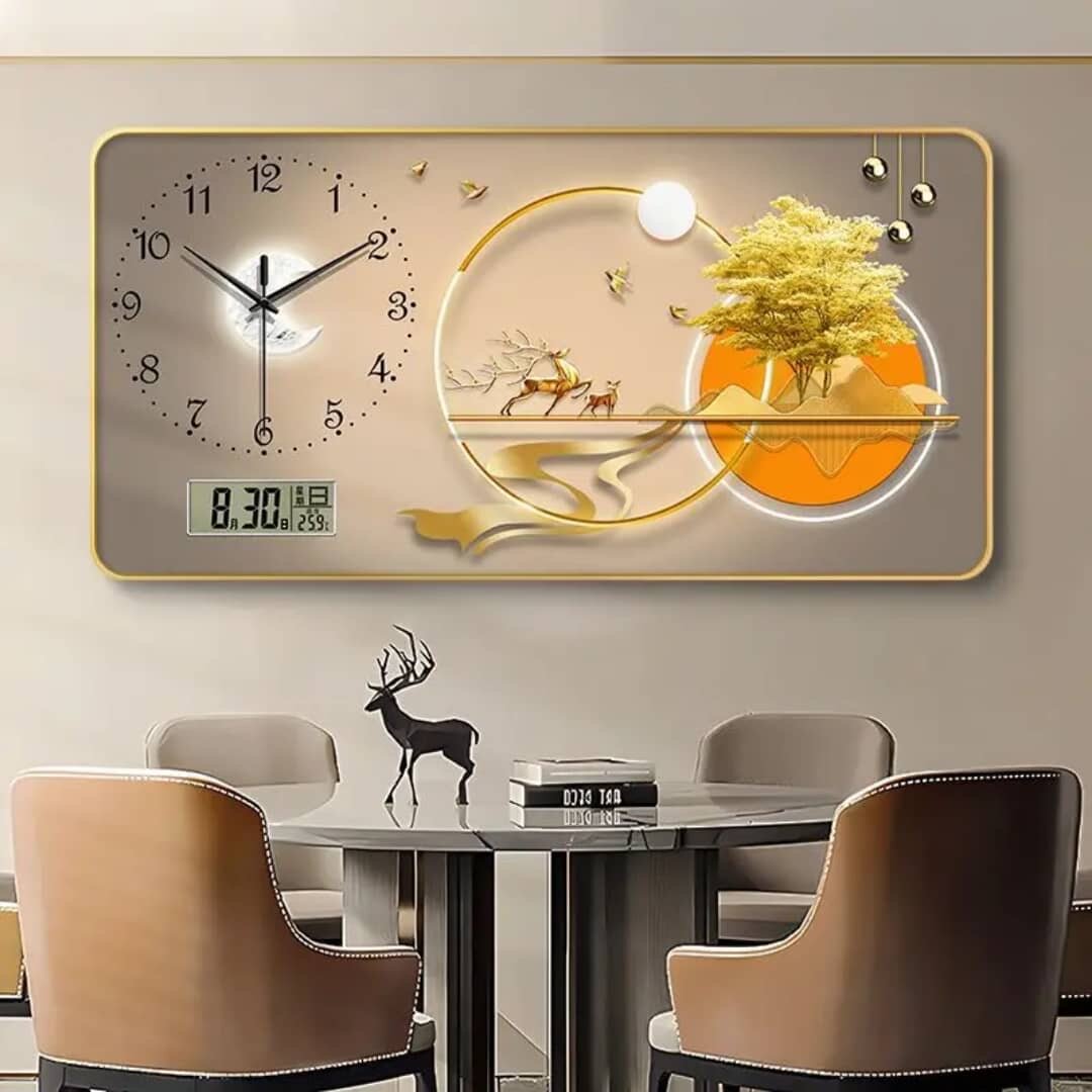 Cette horloge murale élégante combine art et fonctionnalité avec un motif de paysage naturel. Dotée d'une horloge analogique et d'un affichage numérique, elle est parfaite pour une décoration intérieure contemporaine. Idéale pour le salon ou la salle à manger.