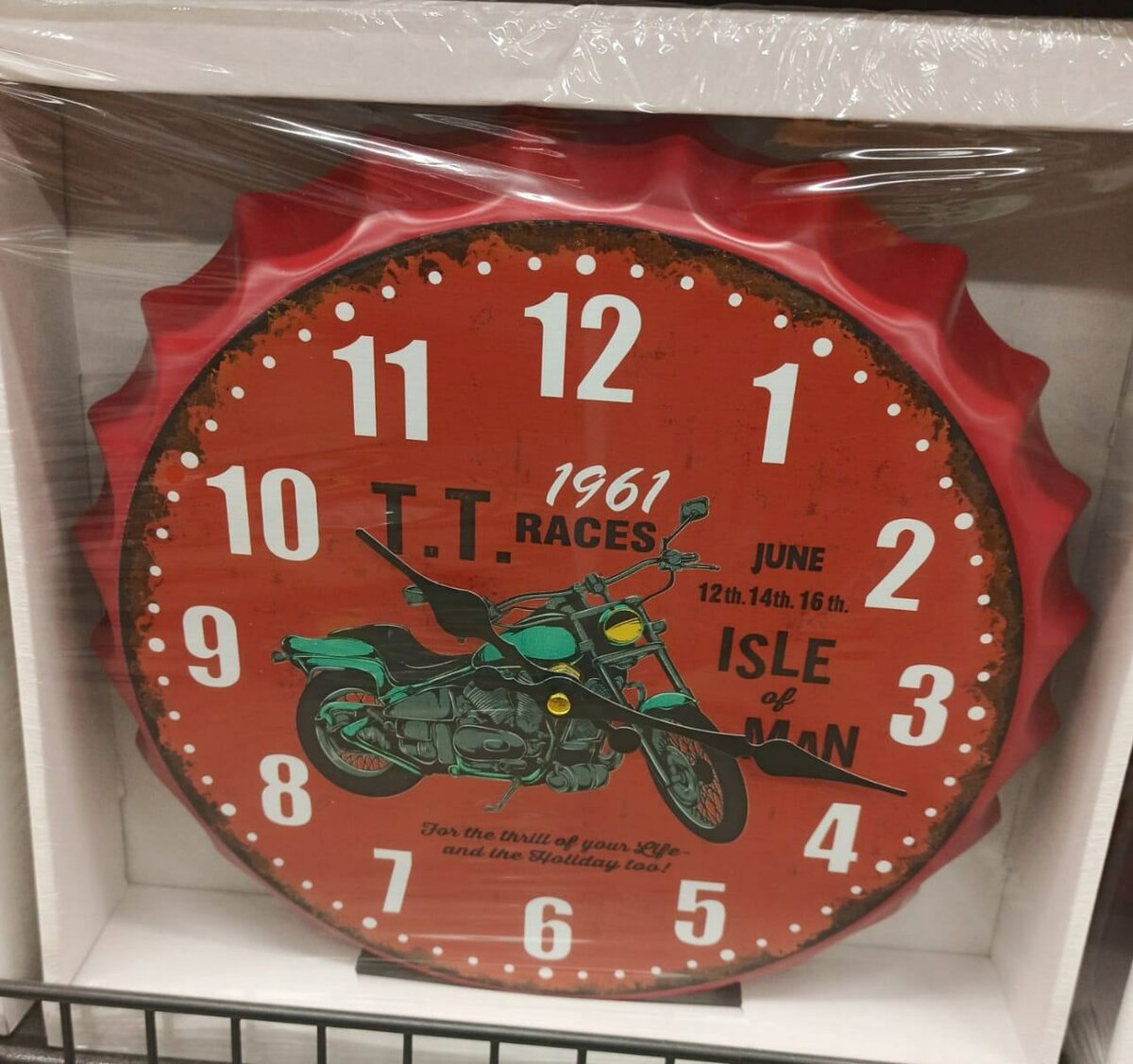 Apportez une touche vintage à votre intérieur avec cette horloge murale inspirée des courses TT de l'île de Man. Son design unique avec une moto rétro et des couleurs vives en fait un ajout captivant à tout espace. Idéale pour les passionnés de moto et de déco rétro.