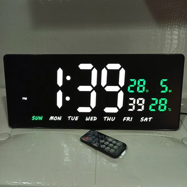 HEURE, ALARME ET TEMPÉRATURE -AFFICHAGE 12/24 -ALARME HORAIRE -RÉGLAGE AUTOMATIQUE DE LA LUMIÈRE -TEMPS BLANC GRANDS CHIFFRES LE RESTE EN VERT -TAILLE 36CM X 16CM X 4CM -ADAPTATEUR AC/DC INCL. -HORLOGE LED MURALE OU DE TABLE -MÉMOIRE INTÉGRÉE