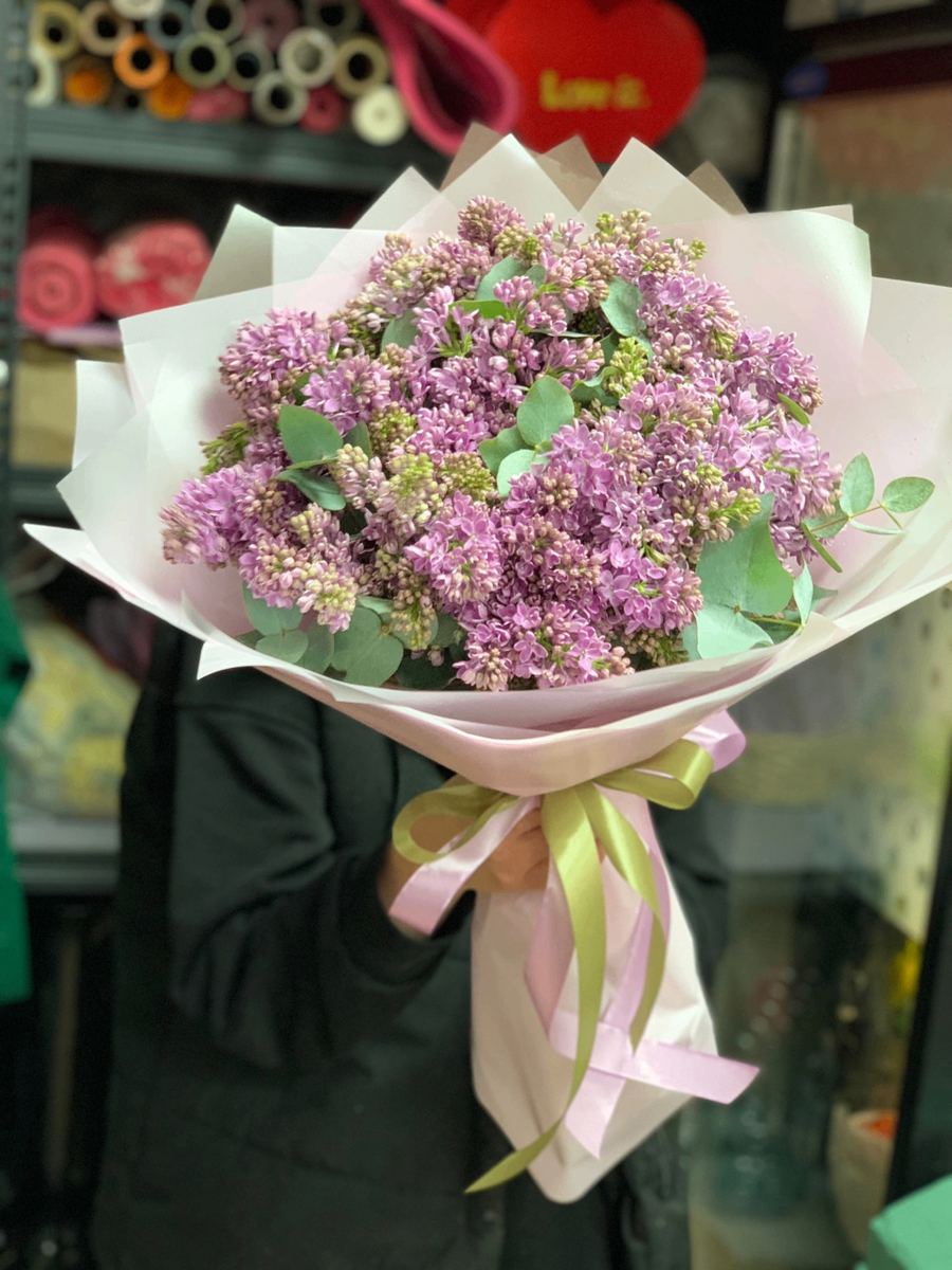 Пышный букет из сирени с оформлением