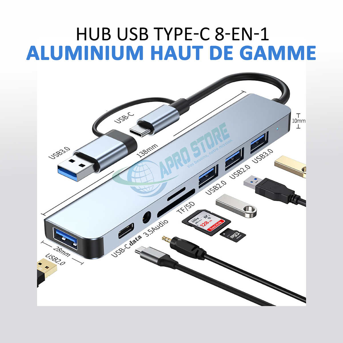 Découvrez notre Hub USB Type-C 8-en-1 en aluminium haut de gamme. Compact et élégant, il offre 8 ports pour connecter tous vos appareils : USB 3.0, USB 2.0, HDMI, et plus encore. Idéal pour les professionnels et les étudiants, il améliore la connectivité de votre ordinateur portable. Parfait pour le bureau ou à domicile.