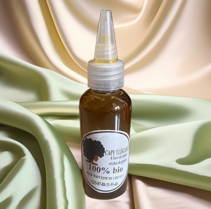 Découvrez l'huile Chebe Capy'Élégance, 100% bio, idéale pour tous types de cheveux. Revitalisez et épaississez vos cheveux grâce aux bienfaits naturels du chebe et du clou de girofle. Appliquez régulièrement pour des résultats visibles : des cheveux plus forts et sains. Transformez votre routine capillaire avec ce soin nourrissant et naturel. Parfait pour renforcer et stimuler la croissance. Essayez-le, vos cheveux vous remercieront!