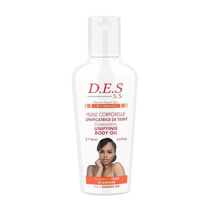 Découvrez notre huile corporelle unifiante D.E.S pour une peau douce et éclatante. Enrichie en huile de Baobab, elle hydrate en profondeur et unifie le teint. Idéale pour tous types de peau, elle est parfaite pour une utilisation quotidienne. Offrez à votre peau le soin qu'elle mérite.