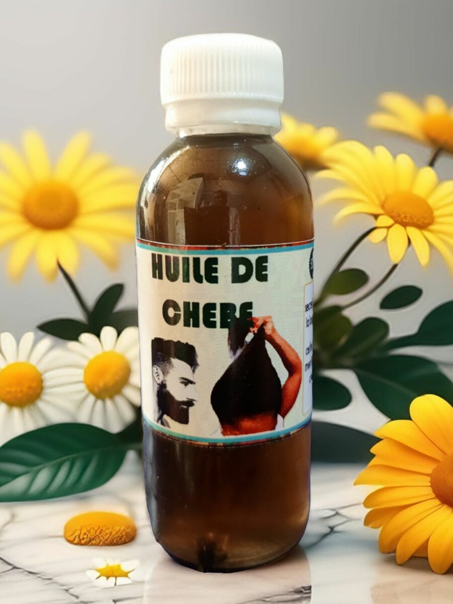 Huile de Chébé : Renforce les cheveux, favorise leur croissance et prévient la casse, idéale pour les soins capillaires.