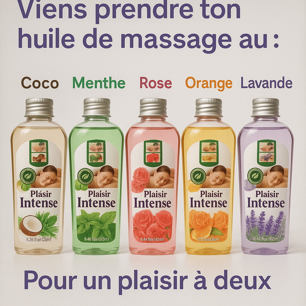 Huile de massage de haute qualité au coco, à la menthe , à la rose à l'orange et à Lavande