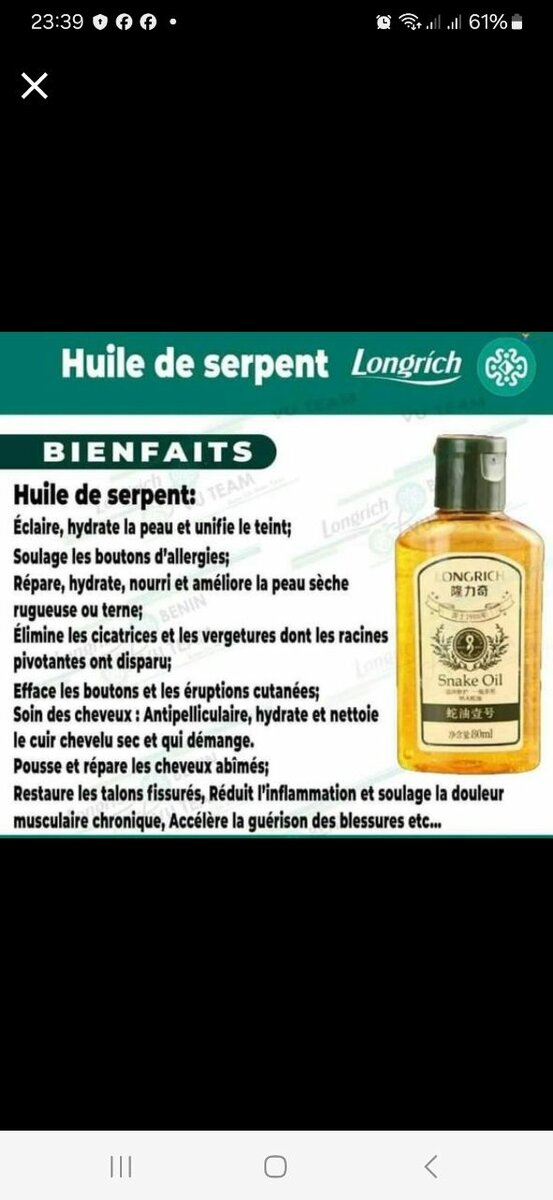 Découvrez l'Huile de Serpent Longrich : pour une peau éclatante et hydratée. Soulage allergie et cicatrices, renforce et nourrit les cheveux. Idéale pour la régénération cutanée et capillaire. Parfait pour un soin complet de beauté.