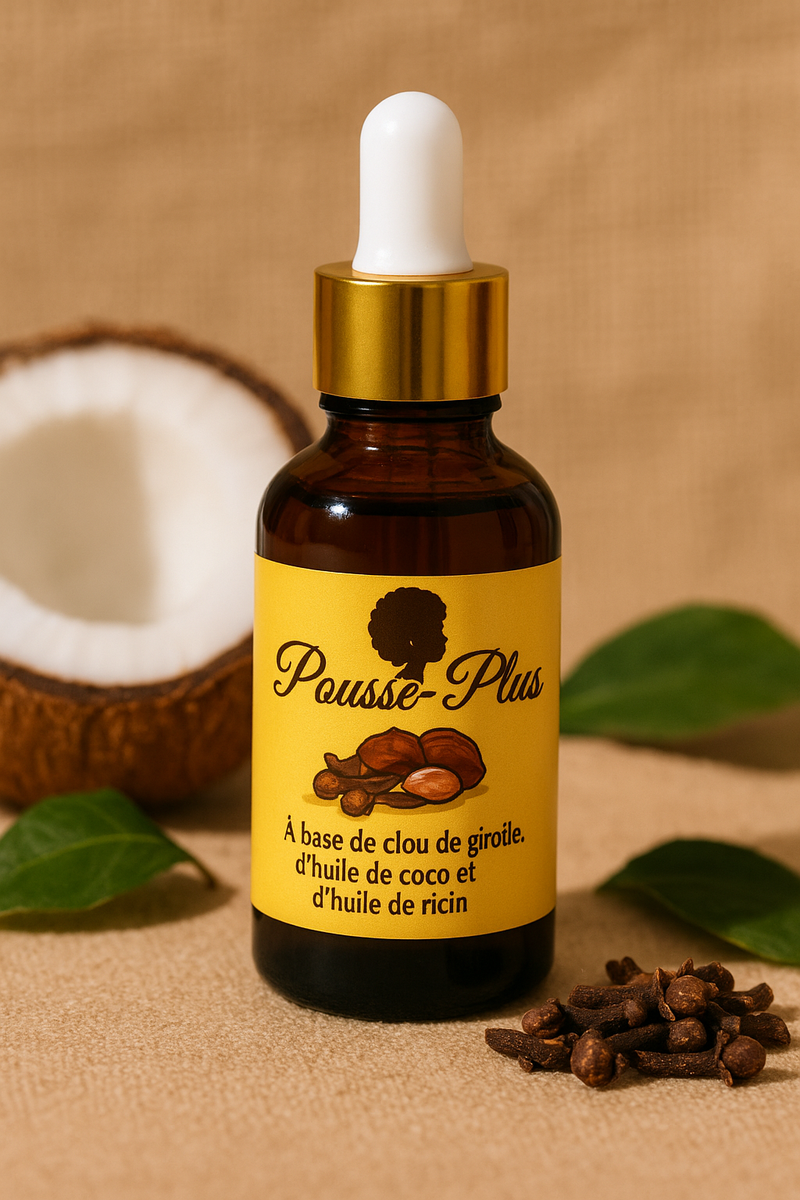 Découvrez l'huile nourrissante Pousse-Plus, enrichie en clou de girofle, huile de coco et ricin. Idéale pour fortifier et sublimer vos cheveux naturels au quotidien. Appropriez-vous une chevelure saine et éclatante!
