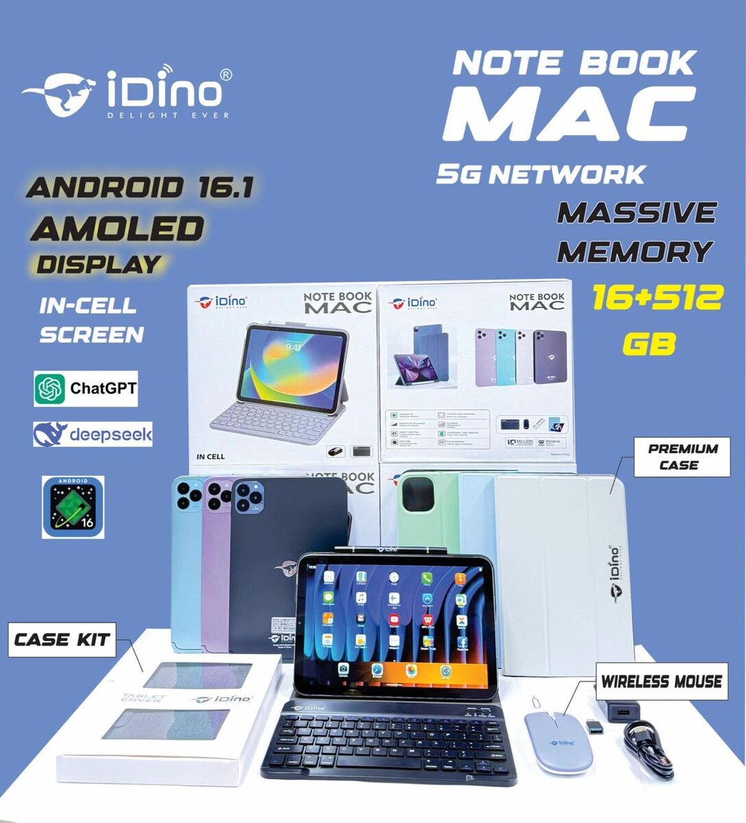 Optez pour le iDino Notebook MAC avec écran AMOLED et 16+512GB de mémoire. Connectivité 5G, idéal pour le travail et le divertissement. Livré en kit avec un étui premium, un étui de protection, un clavier sans fil et une souris sans fil.