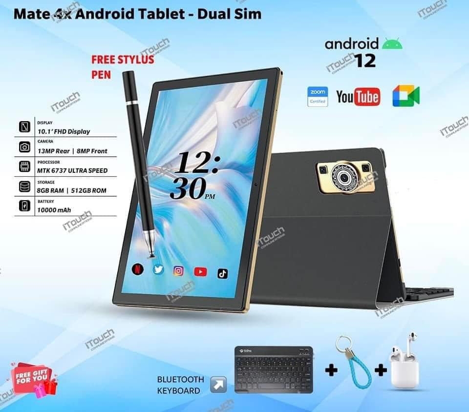12.0 Android version 10.1 inches screen 5G Network 10000 mAh battery Capacity 512GB ROM + 8GB RAM Storage Dual Sim support WiFi and Bluetooth Connectivity Free items includes AirPod Keyboard Flip cover Stylus Pen 🖊️