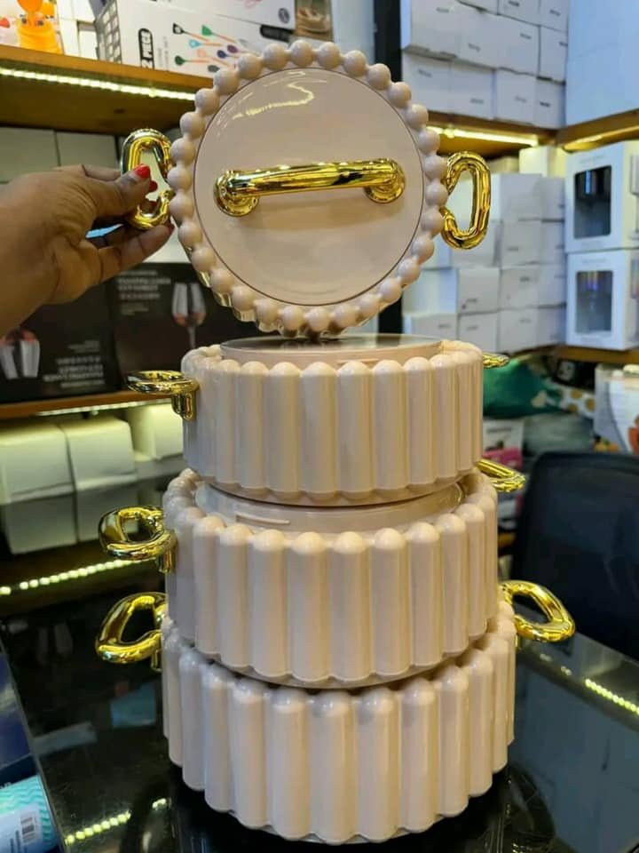 setting with 3 ceramix pots, 2 spoons with a jug, white