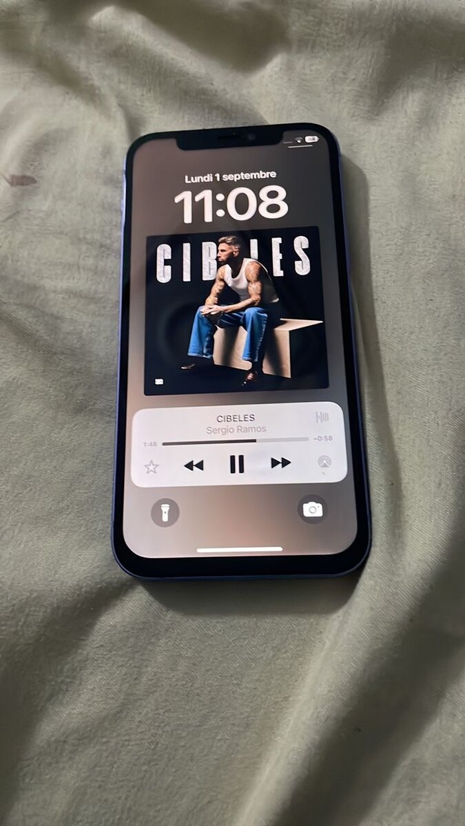 iPhone 12 violet 128 Go. Face ID désactivé, écran changé une fois.