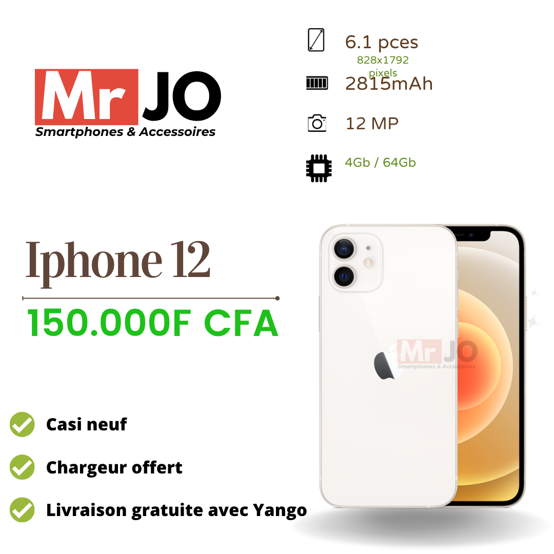 iPhone 12 avec 64GB de stockage. Caméra 12MP, écran 6.1 pouces. Chargeur inclus. Livraison gratuite.