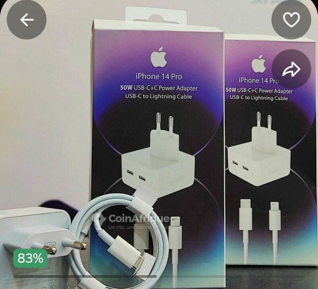 Fast charge your iPhone 14 Pro with this 50W USB-C power adapter and USB-C to Lightning cable. Perfect for quick power-ups, it's designed to ensure optimal charging efficiency and safety. Ideal for travel or home use, this charger keeps your device ready whenever you are.