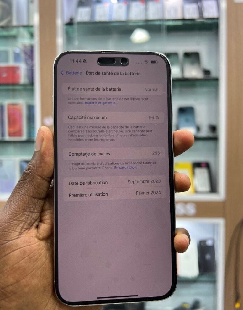 Découvrez le iPhone 15 Pro Max en blanc avec son écran OLED avancé et sa triple caméra exceptionnelle. Avec une capacité de batterie à 96%, ce modèle est quasiment neuf, parfait pour une expérience utilisateur fluide et performante. Idéal pour capturer chaque moment avec une qualité inégalée et bénéficier dun design élégant et moderne. Ne manquez pas cette occasion exceptionnelle!