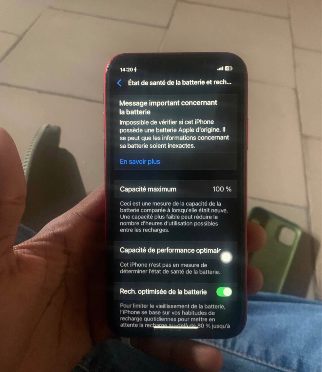 Découvrez l'iPhone rouge élégant avec une batterie à capacité maximale de 100%. Idéal pour ceux qui recherchent performance et style. Profitez de toutes les fonctionnalités dernier cri qu'offre cet appareil.