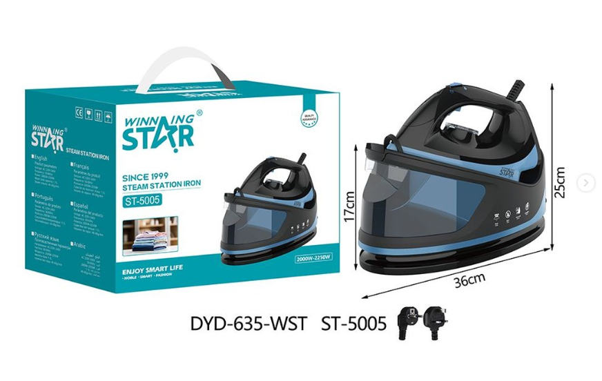 ST-5005 Электрический паровой утюг мощностью 2000–2250 Вт с резервуаром для воды объемом 1,1 л Модель №: СТ-5005 Размер: 37*19*26 см Мощность: 2000 Вт-2250 Вт Напряжение: 220-240 В переменного тока