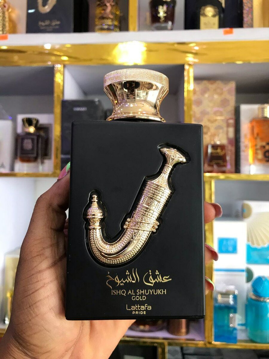 The Ishq Al Shuyukh Gold by Lattafa brings notes of leather with a slightly rubbery vibe and velvety suede tones mixed with high-quality sweet gourmand