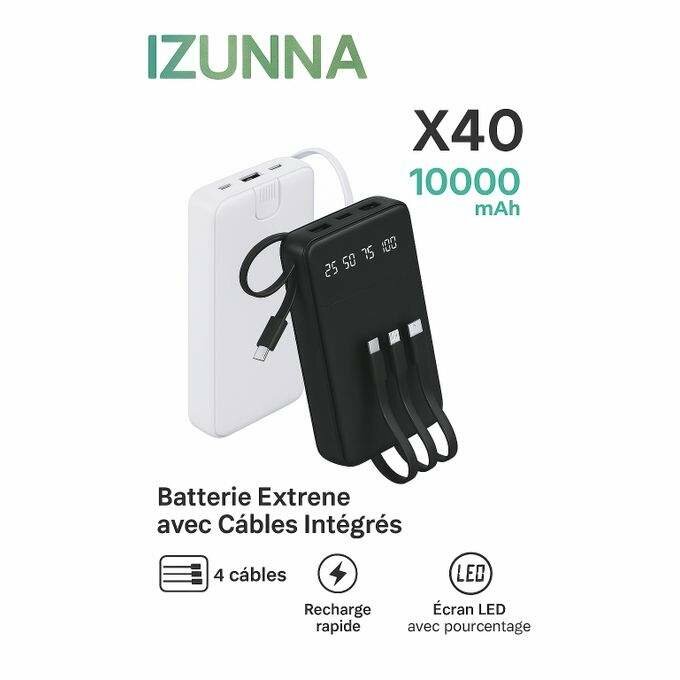 Restez chargé(e) où que vous soyez grâce à la batterie externe portable IZUNNA 10 000 mAh. Dotée de câbles Lightning, Type-C et Micro-USB intégrés, elle est compatible avec la plupart des appareils. Son écran LED affiche le niveau de charge, pour une utilisation intuitive et efficace. Idéale pour les voyages, le travail ou le quotidien, cette batterie externe garantit une charge rapide et fiable. Idéale pour les passionnés de technologie comme pour les professionnels pr