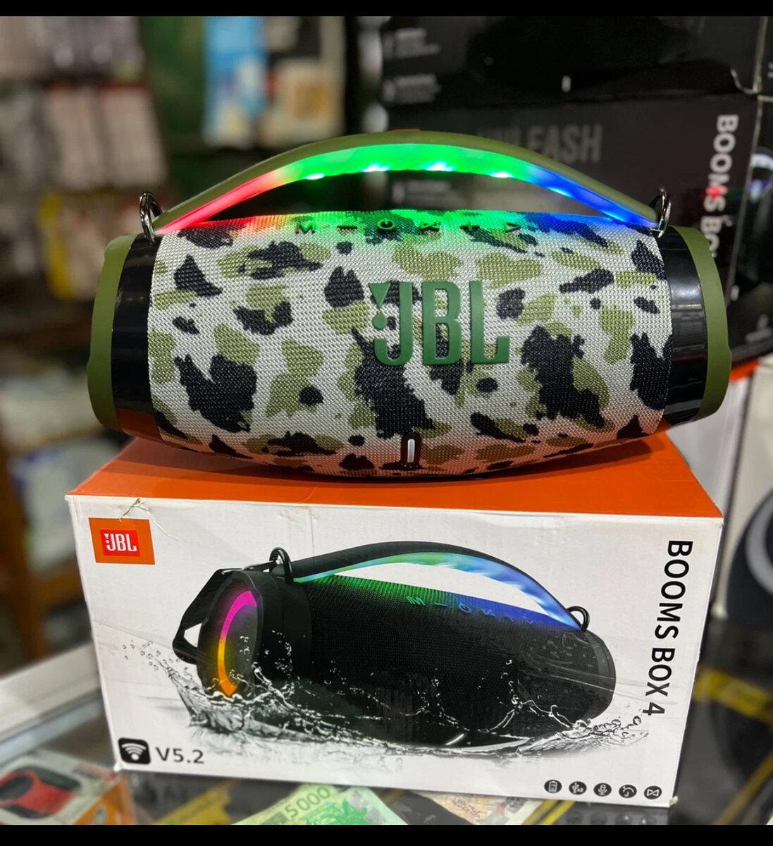 Experience powerful sound with the JBL Boombox in a stylish camouflage design. Perfect for outdoor adventures with waterproof and durable features. Ideal for music lovers seeking high-quality audio.