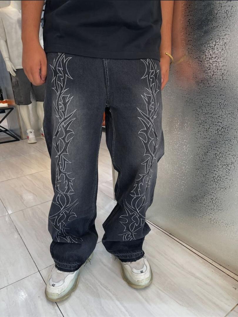 Ce jean ample arbore des motifs tribaux audacieux, parfait pour un look urbain tendance. Conçu pour le confort, il est le choix idéal pour ceux qui cherchent à allier style et aisance. Idéal pour les sorties décontractées ou les occasions informelles, il s'harmonise parfaitement avec vos t-shirts préférés. Un incontournable pour une garde-robe moderne et expressive.