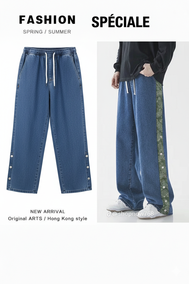 Découvrez ce jean ample et stylé avec une élégante bande sur le côté. Parfait pour un look décontracté tout en restant à la mode, idéal pour le printemps et l'été. Faites sensation avec ce modèle inspiré du style Hong Kong.