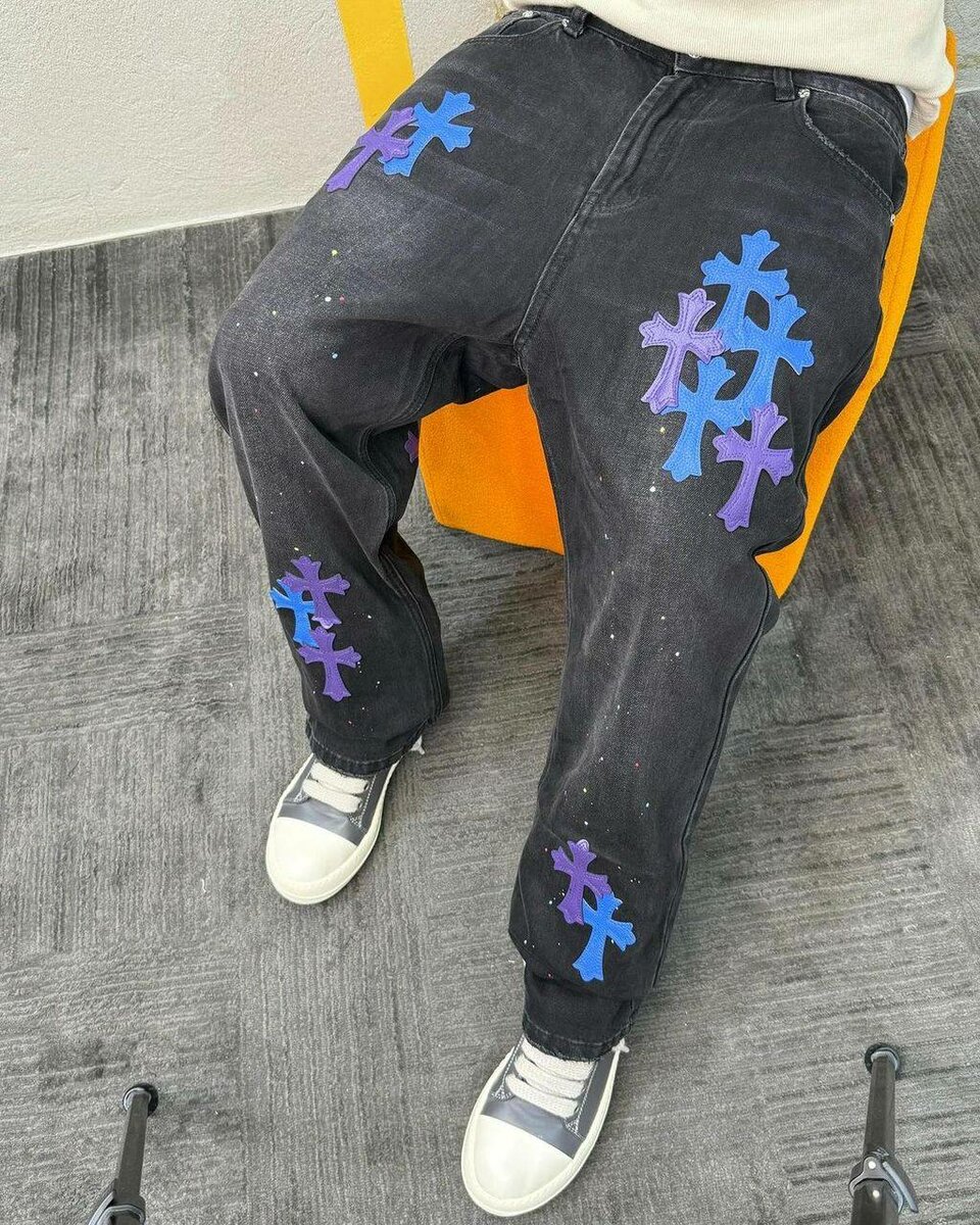 Optez pour un look urbain et décontracté avec ce jean baggy orné de motifs colorés. Parfait pour ajouter une touche audacieuse à votre tenue quotidienne. Ce jean est idéal pour ceux qui aiment exprimer leur style unique.