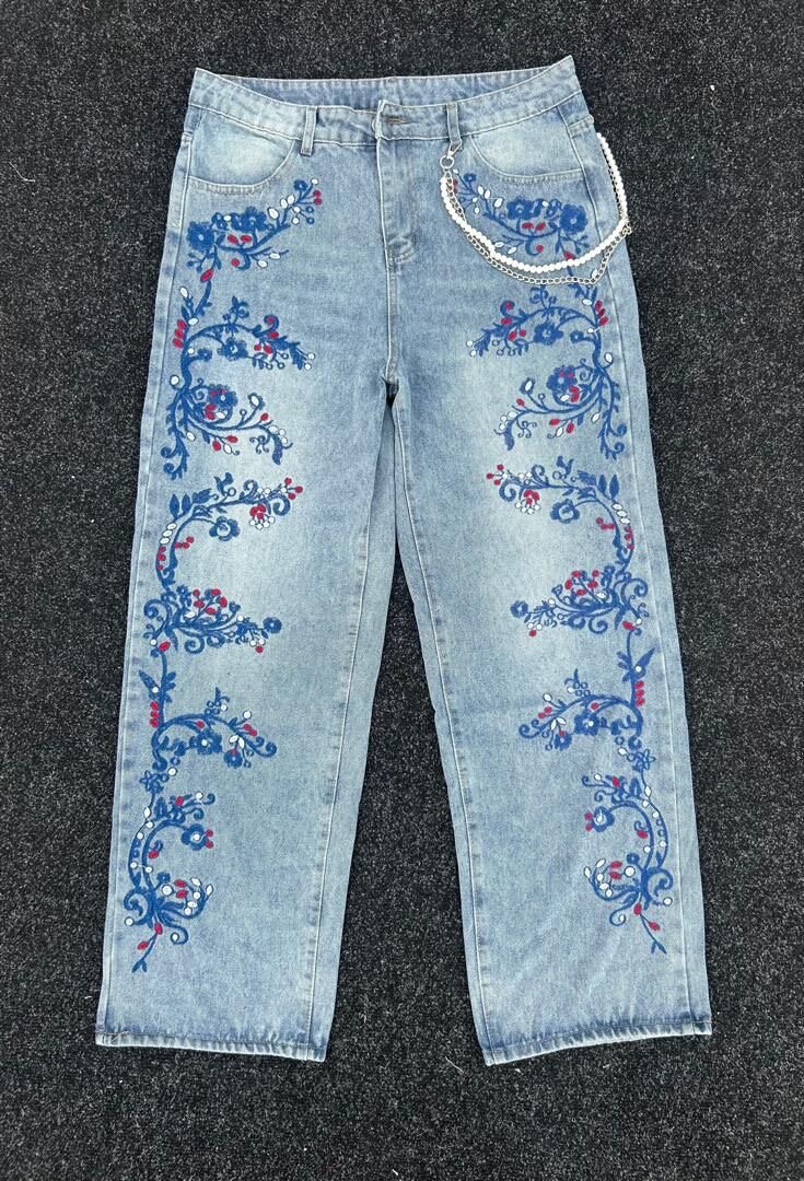 Jean bleu clair avec broderies florales délicates et chaîne décorative. Idéal pour un look décontracté et élégant. Parfait pour les sorties en ville ou les rencontres entre amis.