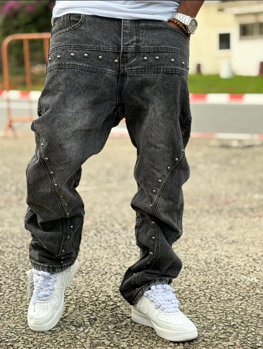 Transformez votre style avec ce jean baggy pour homme, embelli de clous élégants. Idéal pour une tenue urbaine décontractée et tendance. Confortable et résistant, parfait pour le quotidien.
