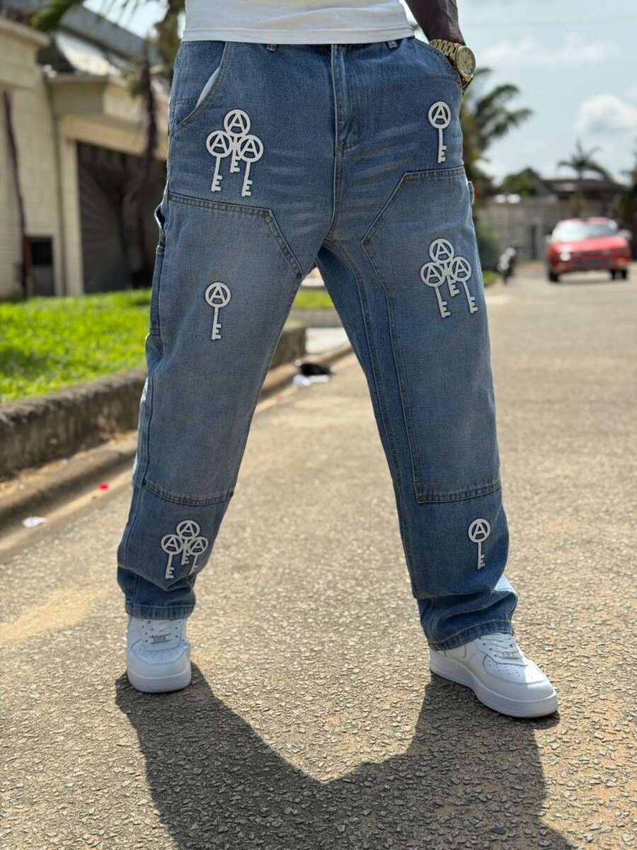 Ce jean baggy arbore un motif streetwear audacieux, idéal pour un look décontracté et tendance. Parfait pour les sorties en ville ou les rassemblements entre amis, sa coupe ample offre confort et style. Associez-le à des baskets pour un ensemble parfait.