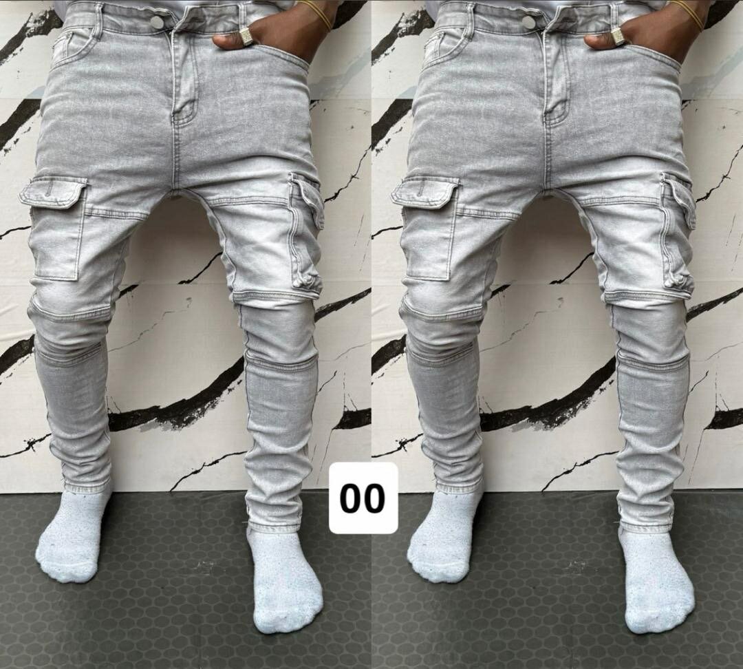Pantalon jean cargo pour hommes, parfait pour un style urbain décontracté. Avec poches pratiques et coupe slim, idéale pour toute occasion moderne.