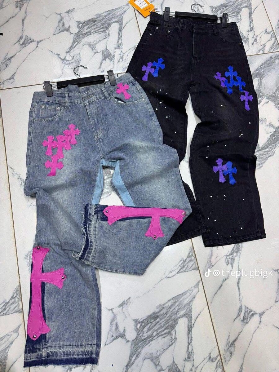 Pantalons en denim avec motifs graffiti colorés. Idéal pour un style urbain et décontracté, ces jeans allient confort et originalité. Parfaits pour les occasions informelles et les sorties entre amis.