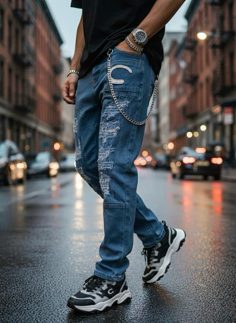 Découvrez ce jean décontracté pour homme, parfait pour un look urbain et moderne. Conçu avec une chaîne stylée et des détails usés, il est idéal pour les sorties décontractées en ville. Associez-le à vos sneakers préférées pour un style assuré. Confortable et tendance, ce jean deviendra vite un incontournable de votre garde-robe.