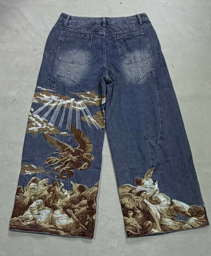 Ces jeans droits amples présentent un imprimé oiseau sur les côtés. Conçus pour un confort optimal, ils sont idéaux pour une tenue décontractée.