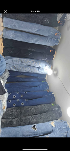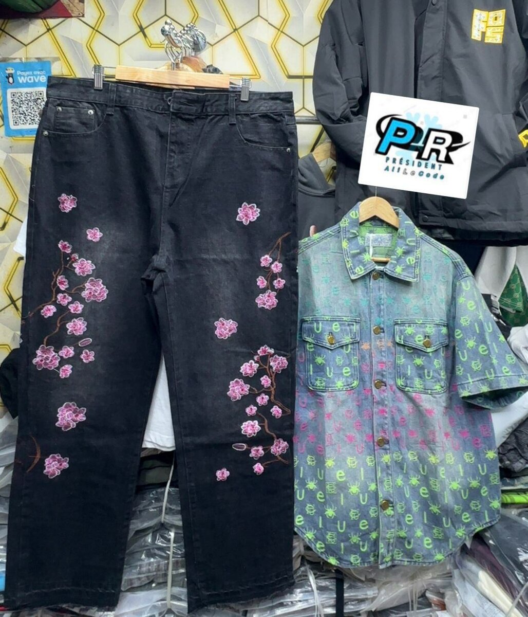 Jean noir avec motifs floraux roses et chemise en denim imprimée. Pour un look tendance et unique. Parfait pour les sorties et les occasions décontractées.