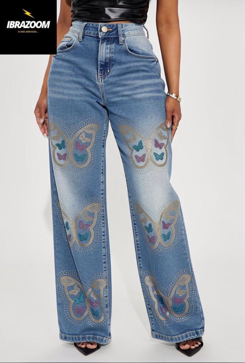 Découvrez ce jean évasé bleu, orné de motifs papillon élégants. Parfait pour un look bohème et chic. Idéal avec des talons ou des baskets pour un style décontracté. Fabriqué avec des matériaux confortables, il est parfaitement adapté à toutes les occasions.